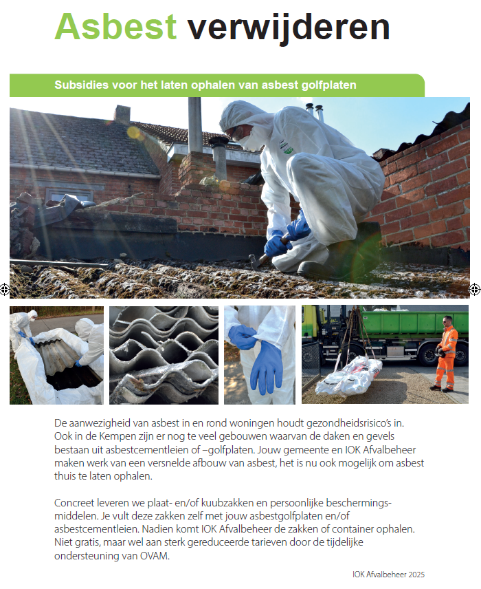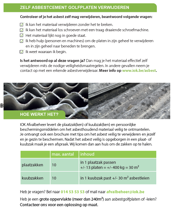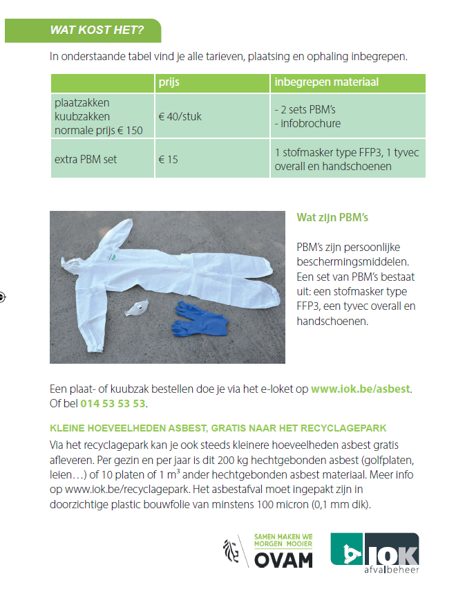 | Bouw- en sloopafval: asbesthoudend afval | < 1m³ per gezin per jaar: gratis > 1m³ €6 voor 1/5m³ |