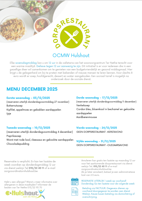 - Annuleren kan gratis ten laatste op maandag 12 uur voor het aankomende dorpsrestaurant. Bij latere annulering wordt een administratieve vergoeding van 2,5 euro aangerekend. Inschrijven en annuleren kan via de dienst Welzijn: telefonisch op 015 22 40 11 of via zorgcoördinator@hulshout.be.