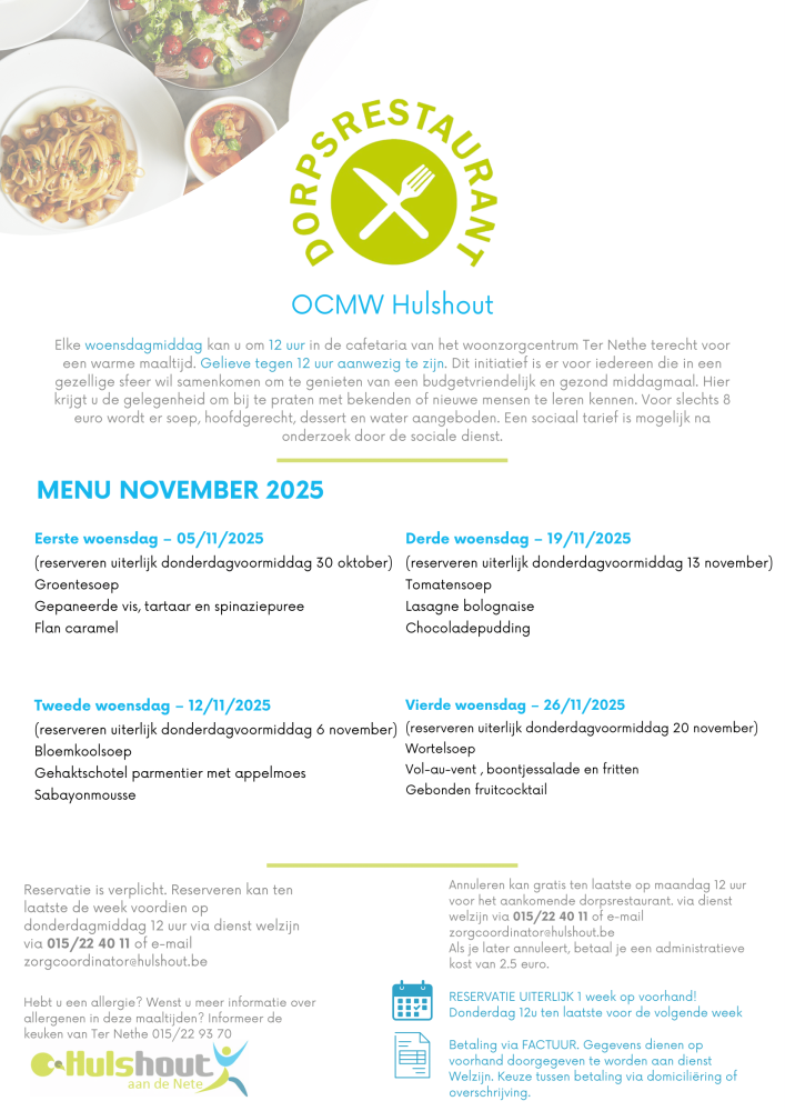 - Annuleren kan gratis ten laatste op maandag 12 uur voor het aankomende dorpsrestaurant. Bij latere annulering wordt een administratieve vergoeding van 2,5 euro aangerekend. Inschrijven en annuleren kan via de dienst Welzijn: telefonisch op 015 22 40 11 of via zorgcoördinator@hulshout.be.
