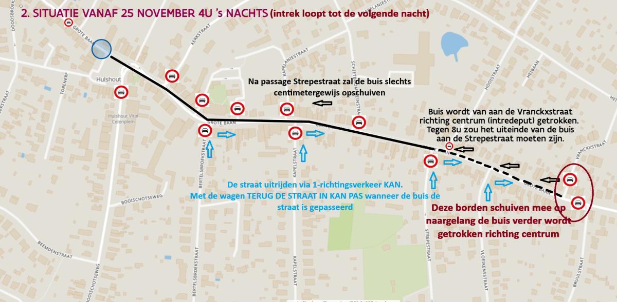- LOCATIE VAN DE LASZONE VAN FASE 1b - van de kerk van Hulshout tot aan de Vranckxstraat - over deze afstand zullen de leidingdelen aan de kant van het fietspad liggen. Bewoners met een oneven huisnummer zullen niet aan hun oprit geraken met de auto. Bewoners met een even huisnummer kunnen wel met de wagen aan hun oprit. De Grote Baan wordt eenrichtingsverkeer in de richting van Heultje.
